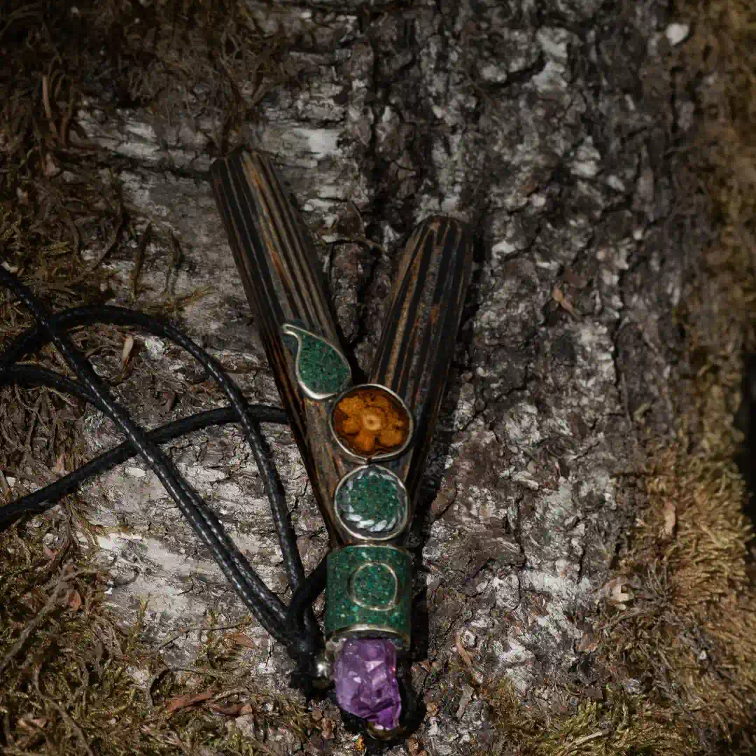 Edle Steine: Ein klarer Bergkristall und ein feiner Amazonit verzieren das handgearbeitete Holzobjekt und verleihen ihm eine besondere Ästhetik.