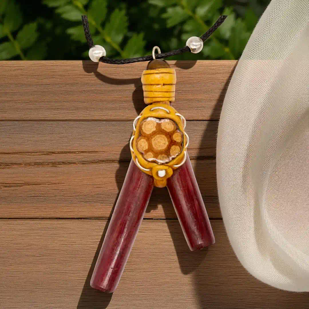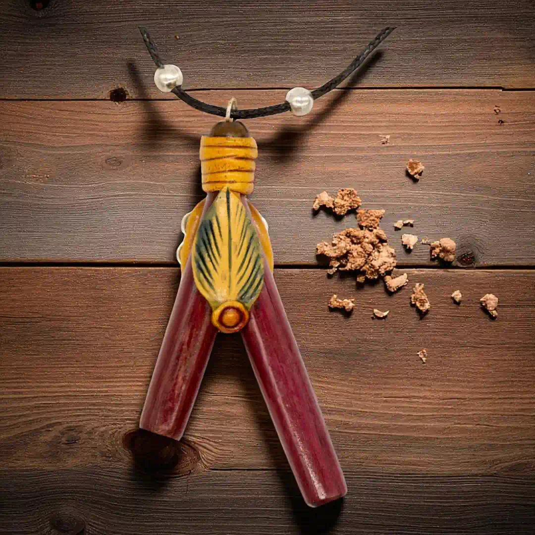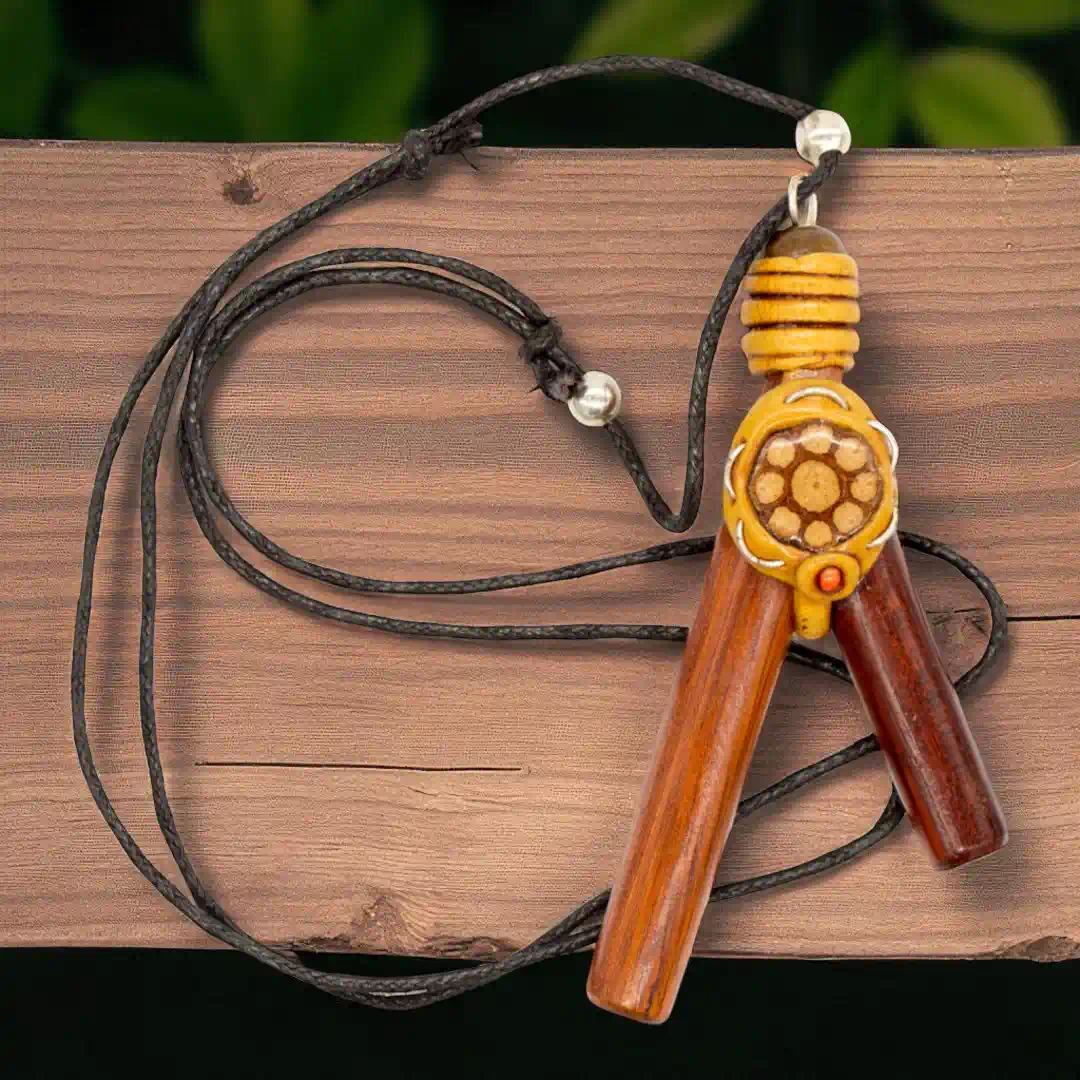 Dieses handgefertigte Objekt aus Peru ist ein besonderes Zeugnis amazonischer Handwerkskunst. Durch das integrierte Medaillon aus echtem Amazonas-Holz (Cielo-Liane) trägst du ein Stück traditioneller Naturgeschichte direkt als Schmuckstück.
