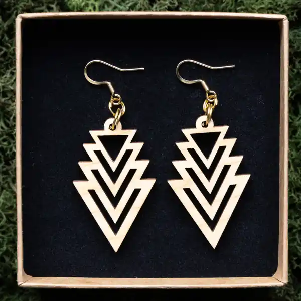 Die natürliche Schönheit des Holzes trifft auf die faszinierende Komplexität von Fraktalmustern in unserem Ohrring Fraktal Triangle. Jedes Stück ist ein Unikat, das die Schönheit der Natur widerspiegelt und gleichzeitig eine zeitlose Eleganz ausstrahlt. Mit ihrer leichten und doch robusten Konstruktion sind diese Ohrringe perfekt für den täglichen Gebrauch geeignet und verleihen jedem Look einen Hauch von Mystik und Raffinesse.