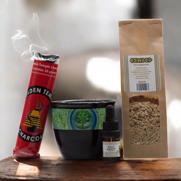 Im Palo Santo Öl – Räucherset enthalten sind außerdem 250 g feuerfester Räuchersand, der als sichere Unterlage für die Kohle dient und gleichzeitig die Wärme sanft verteilt. Die 10 Stück Golden Temple Räucherkohle brennen zuverlässig, entzünden sich leicht und bieten die perfekte Grundlage, um das Palo Santo Öl tropfenweise aufzutragen. Sobald die Kohle glüht, entfaltet das Öl seine volle, tief aromatische Kraft – ein Duft, der reinigt, beruhigt und energetisiert.