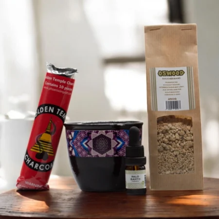 Dieses Palo Santo Öl – Räucherset enthält eine von drei Räucherschalen, 5 ml Palo Santo Öl, 250 g Räuchersand und 10 Stück Golden Temple Räucherkohle – alles, was man für ein vollständiges Räucherritual benötigt.