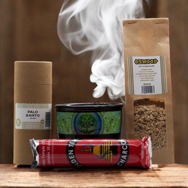 Der enthaltene Räuchersand (250 g) ist feuerfest und perfekt geeignet, um die Kohle sicher zu betten. Er verteilt die Hitze gleichmäßig, schützt die Schale und sorgt dafür, dass das Palo Santo Pulver seinen Duft langsam, gleichmäßig und mit voller Kraft entfalten kann. Die Golden Temple Räucherkohle (10 Stück) glüht zuverlässig und bildet die ideale Grundlage, um das Pulver in feinen Portionen aufzulegen.